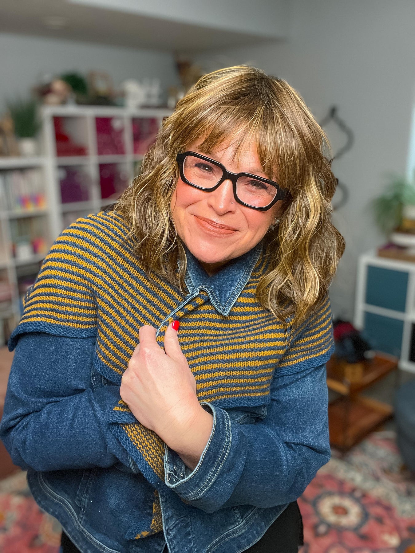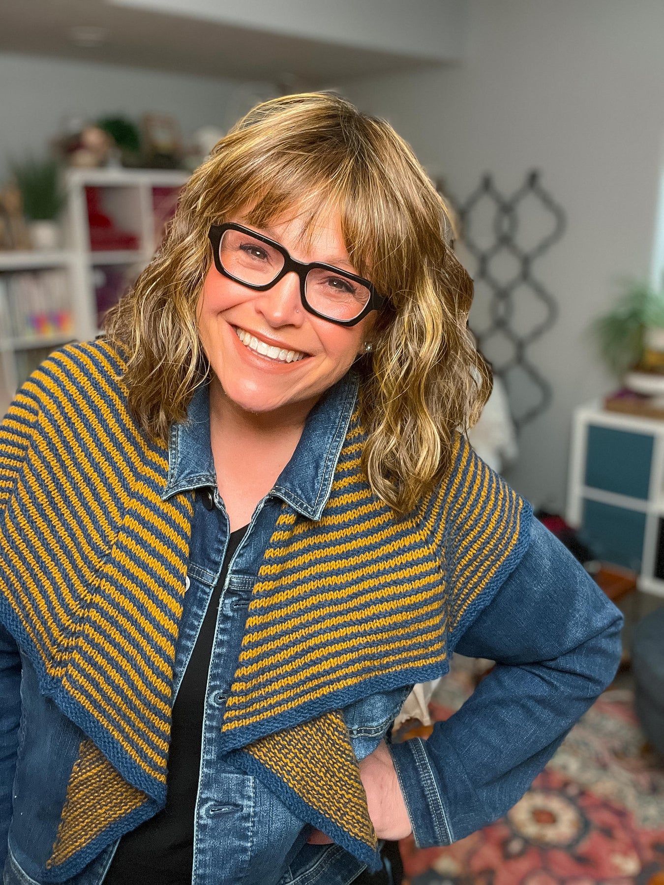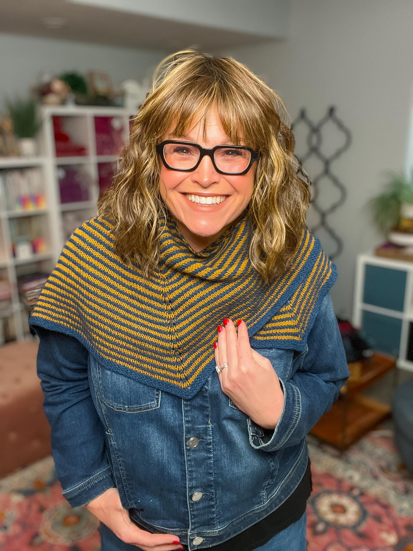 Worked flat in rows, the stripes are created by changing colors every two rows — and there’s no need to cut your yarn each time. Simply carry the color up the side and keep stitching. The result? Clean lines, beautiful rhythm, and a shawl that drapes like a dream.